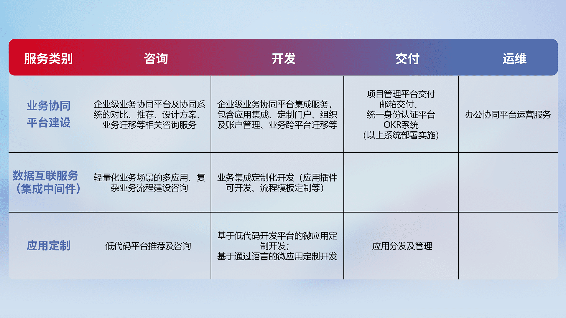 针对钉钉、、、企微、、、、IDaas等平台级产品提供产品的规划、、、、方案、、、、交付、、、定制化开发等服务,,,,实现如统一协同办公、、、智能客户服务、、混合会议管理、、、智能数据查询、、、、等业务场景,,,实现数字化转型。。。