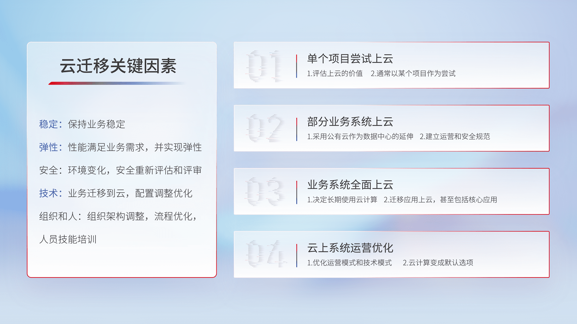结合实际业务,,,从规划设计、、、云平台选型、、云原生改造、、、、数据迁移、、、集成交付,,迁移全过程为客户识别最佳上云路径,,做好风险识别管理,,,设计网络架构、、、、身份权限、、、安全审计合规、、、、操作审计、、、、日志审计、、、监控告警策略、、多站点容灾设计等,,,对云上基础设施进行整体规划,,,,提升IT治理水平,,,以满足弹性、、、、高可用、、、高性能的需求。。。。