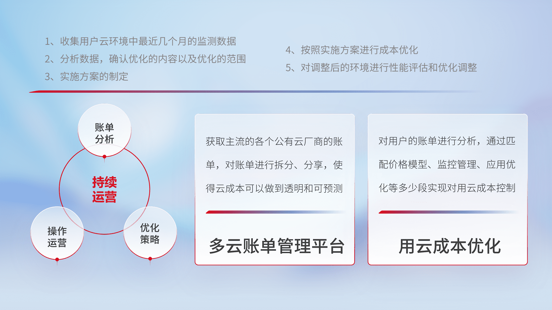 通过多云纳管,,,以统一的资源数据模型把客户的云资源进行抽象和封装,,,,进而实现对多云资源的统一操作,,,,保障云资源管理的可靠性、、、、稳定性与可用性。。。量身定制化运维内容,,,,配置、、、开发运维、、、、补丁管理、、、备份、、、、监控、、、认证和访问管理、、、审计和日常巡检等,,,保障在用云过程中的可靠度,,,稳定度以及高可用率。。。。